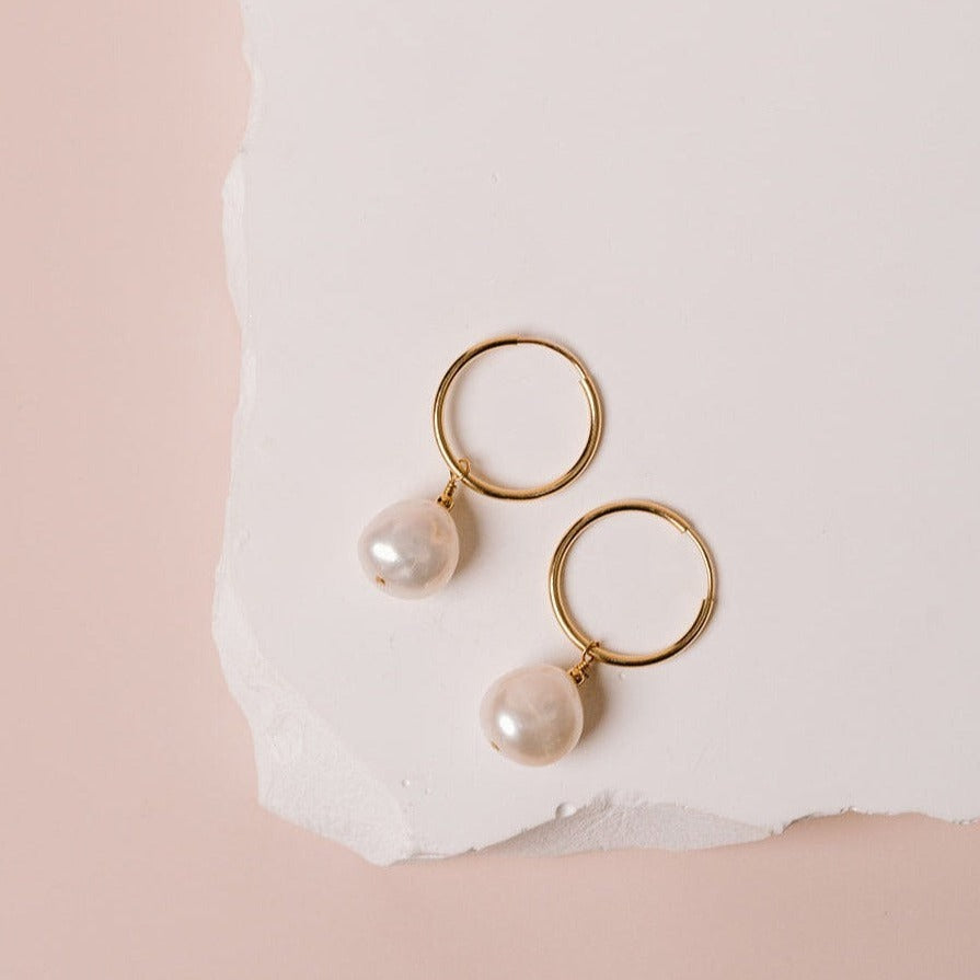 Our baroque pearl hoops are adorned with a hand wired genuine baroque pearl.