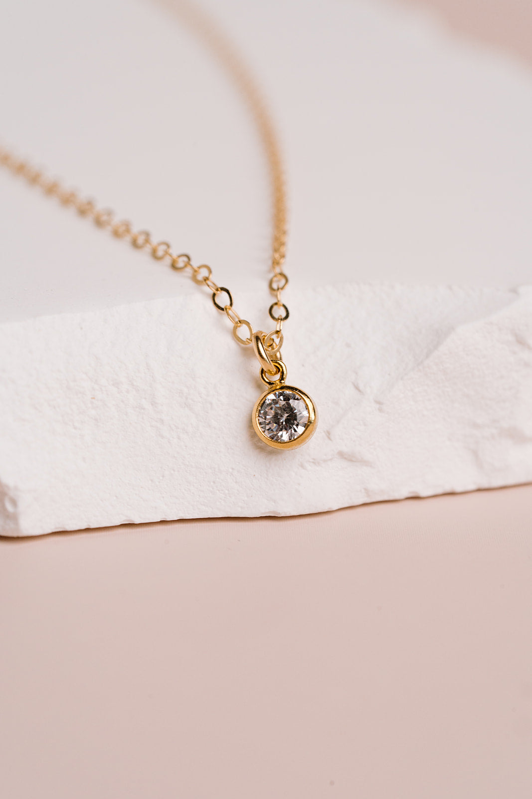 A dainty bezel set cz gemstone hangs beautifully from our sparkly signature chain.