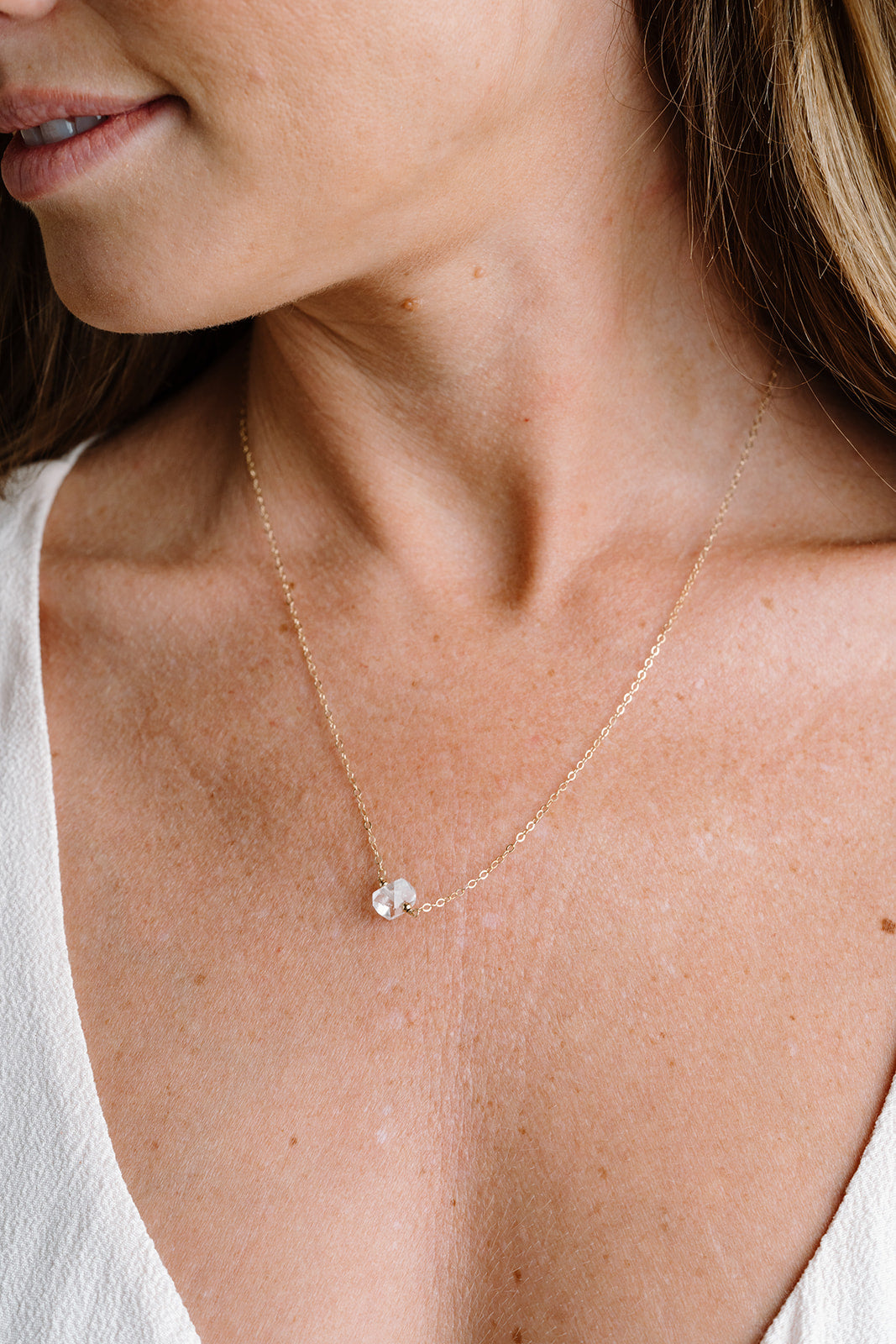 Delicate natural and raw, a single genuine herkimer diamond is wire wrapped by hand and hangs beautifully from a sparkly cable chain.