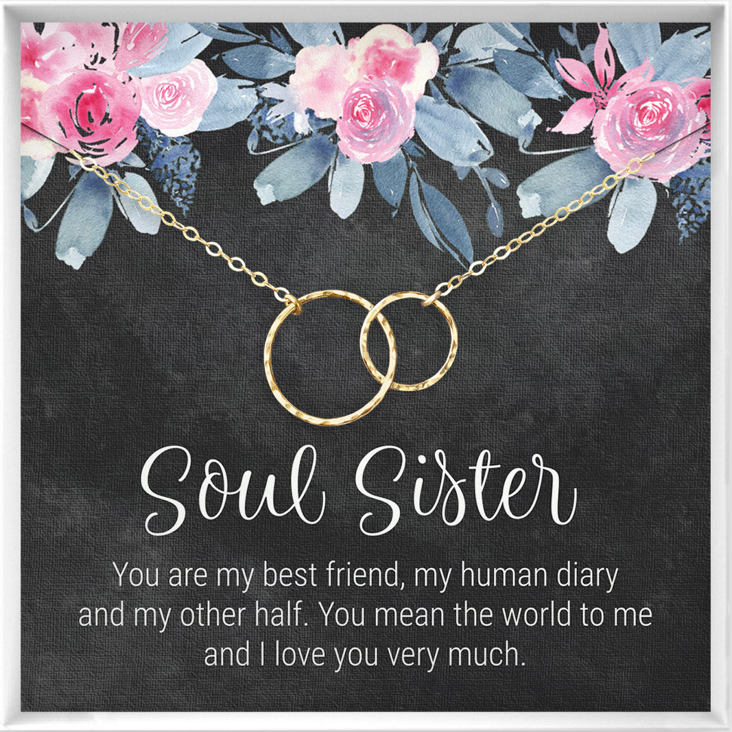 A set of interlocking circles hangs beautifully from our sparkly signature chain.