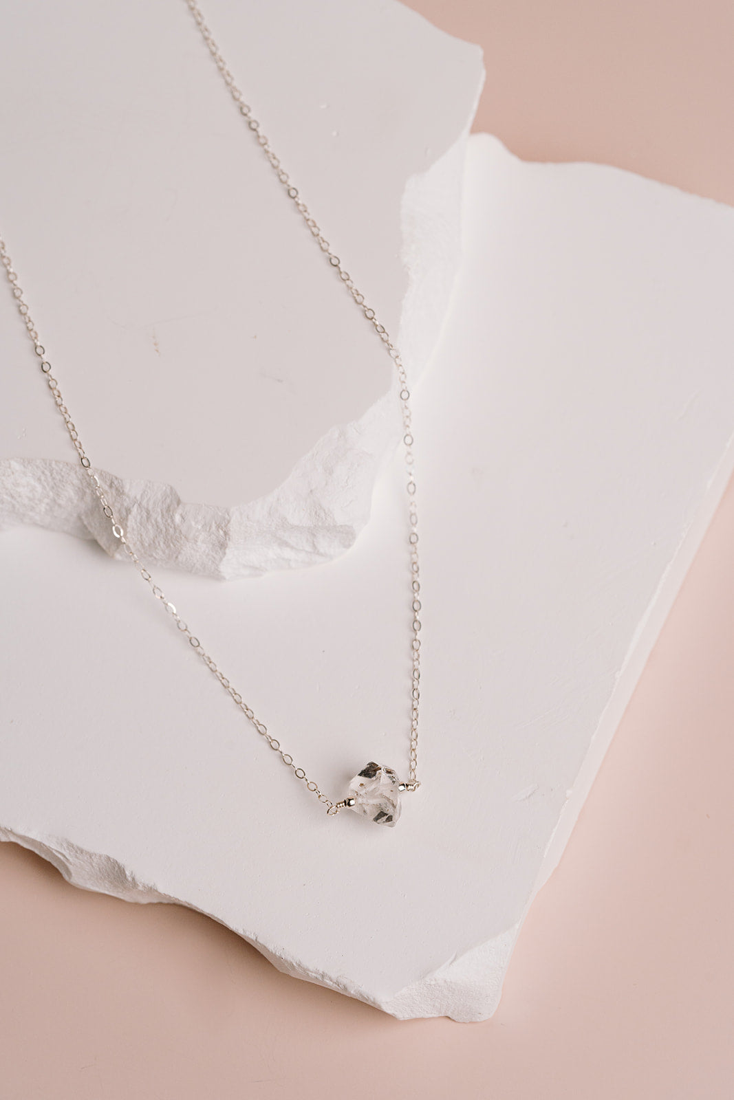 Delicate natural and raw, a single genuine herkimer diamond is wire wrapped by hand and hangs beautifully from a sparkly cable chain.
