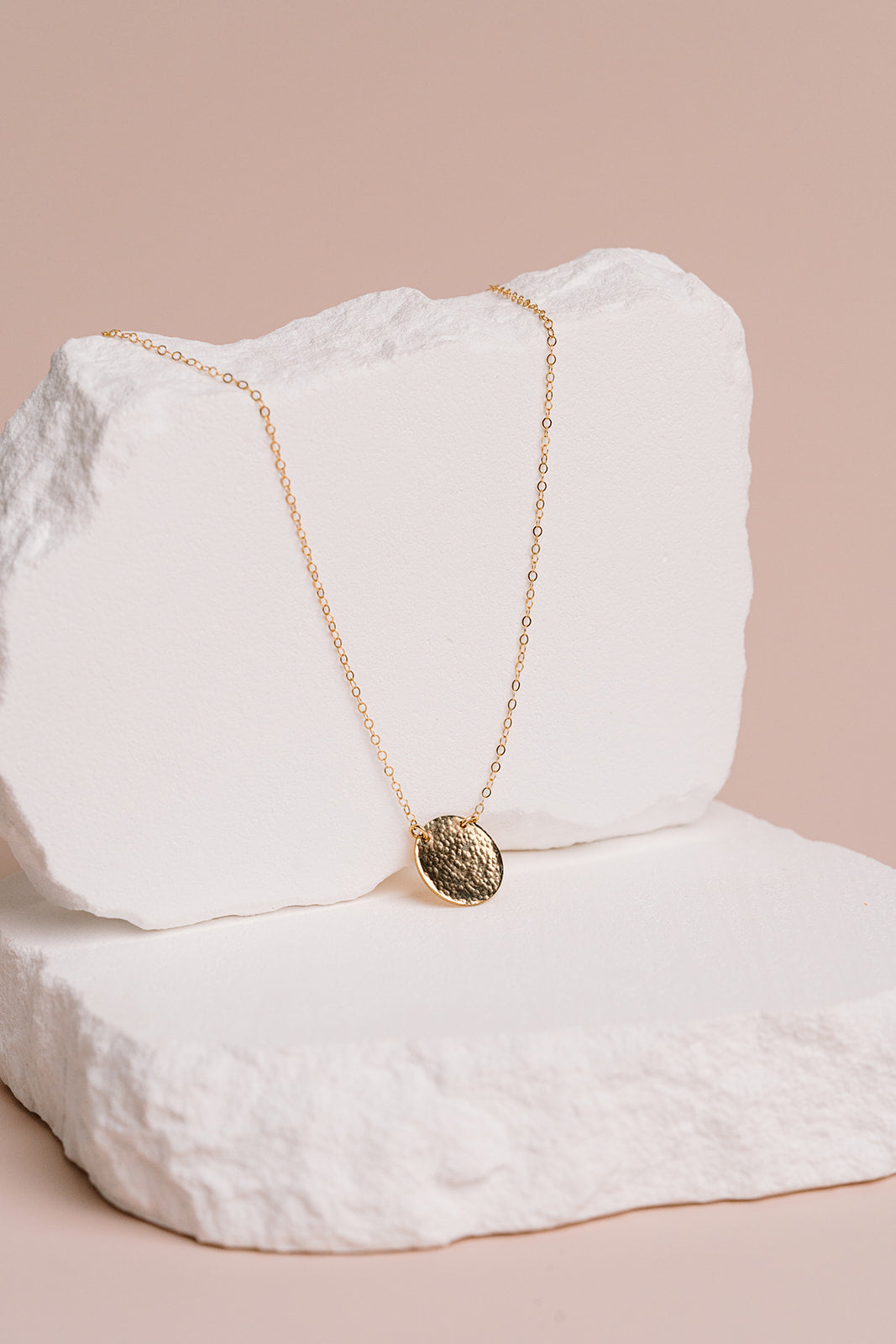 This suspended hammered disc necklace is hand hammered hundreds of times in our studio, then polished to a high shine.