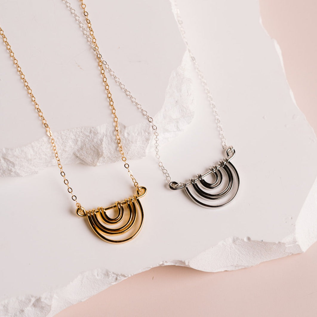 Hammered crescent bars representing an upside down rainbow hangs beautifully from our sparkly signature chain.