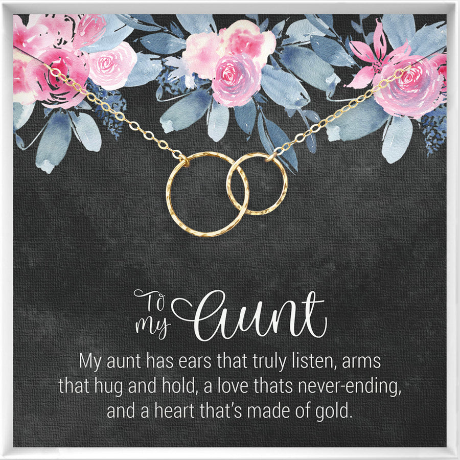 A set of interlocking circles hangs beautifully from our sparkly signature chain.