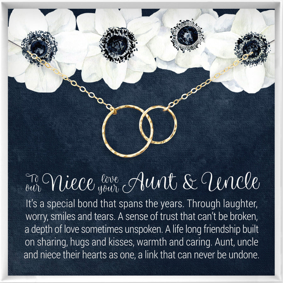 A set of interlocking circles hangs beautifully from our sparkly signature chain.