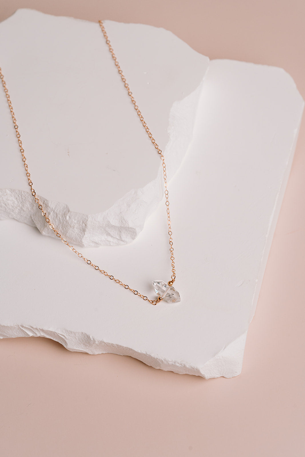 Delicate natural and raw, a single genuine herkimer diamond is wire wrapped by hand and hangs beautifully from a sparkly cable chain.