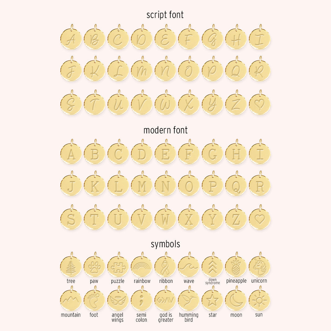 Hand stamped with 1 initial OR 1 symbol per charm.