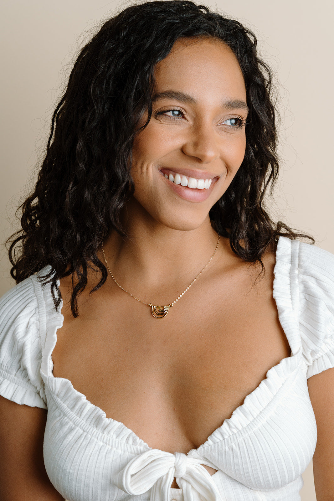 A set of interlocking circles hangs beautifully from our sparkly signature chain.