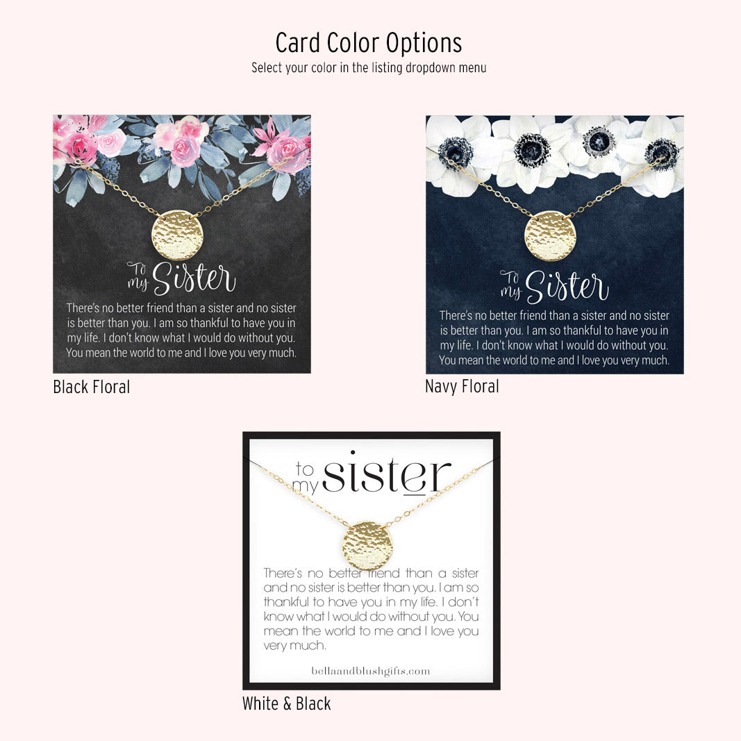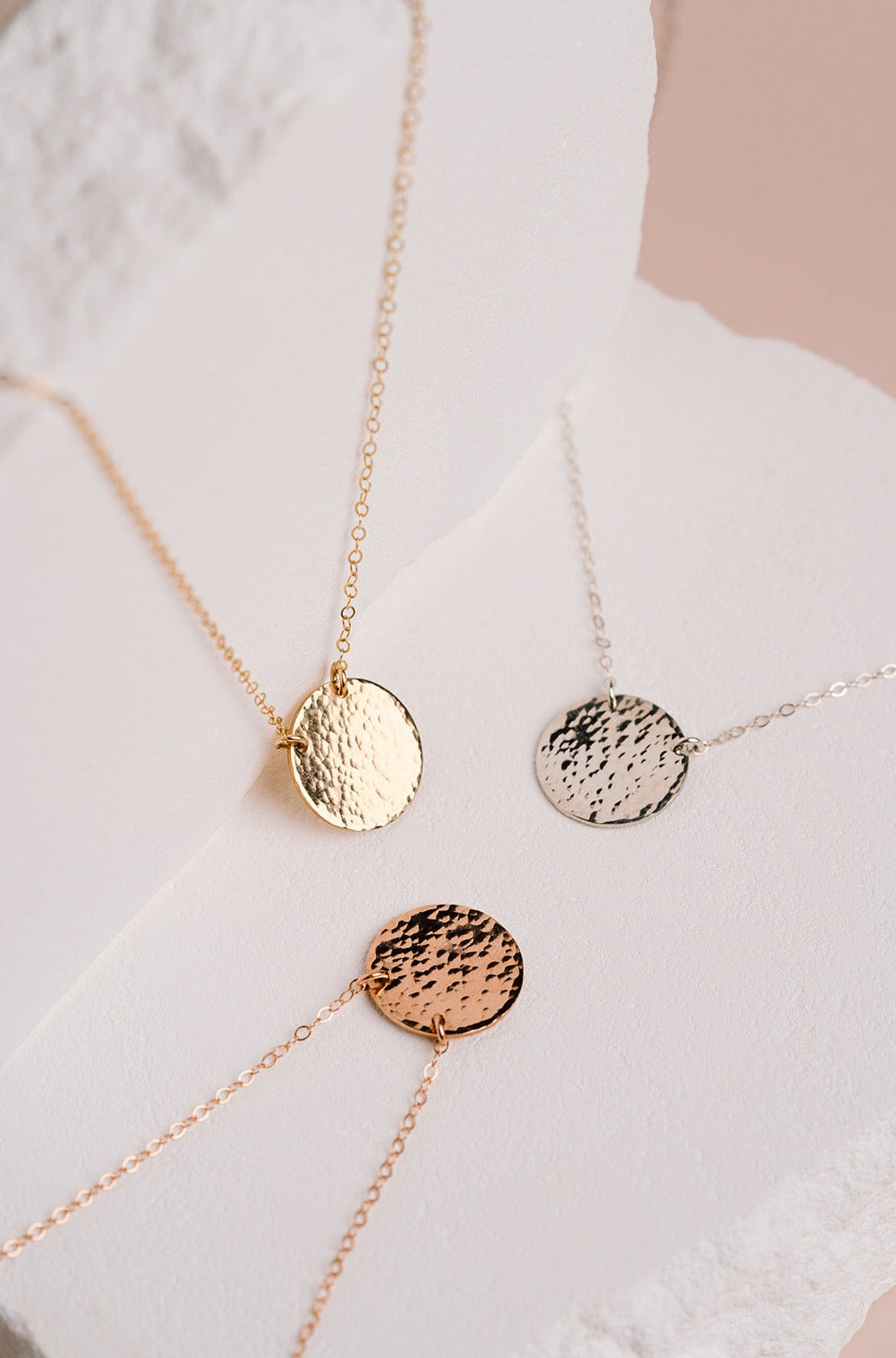 This suspended hammered disc necklace is hand hammered hundreds of times in our studio, then polished to a high shine.