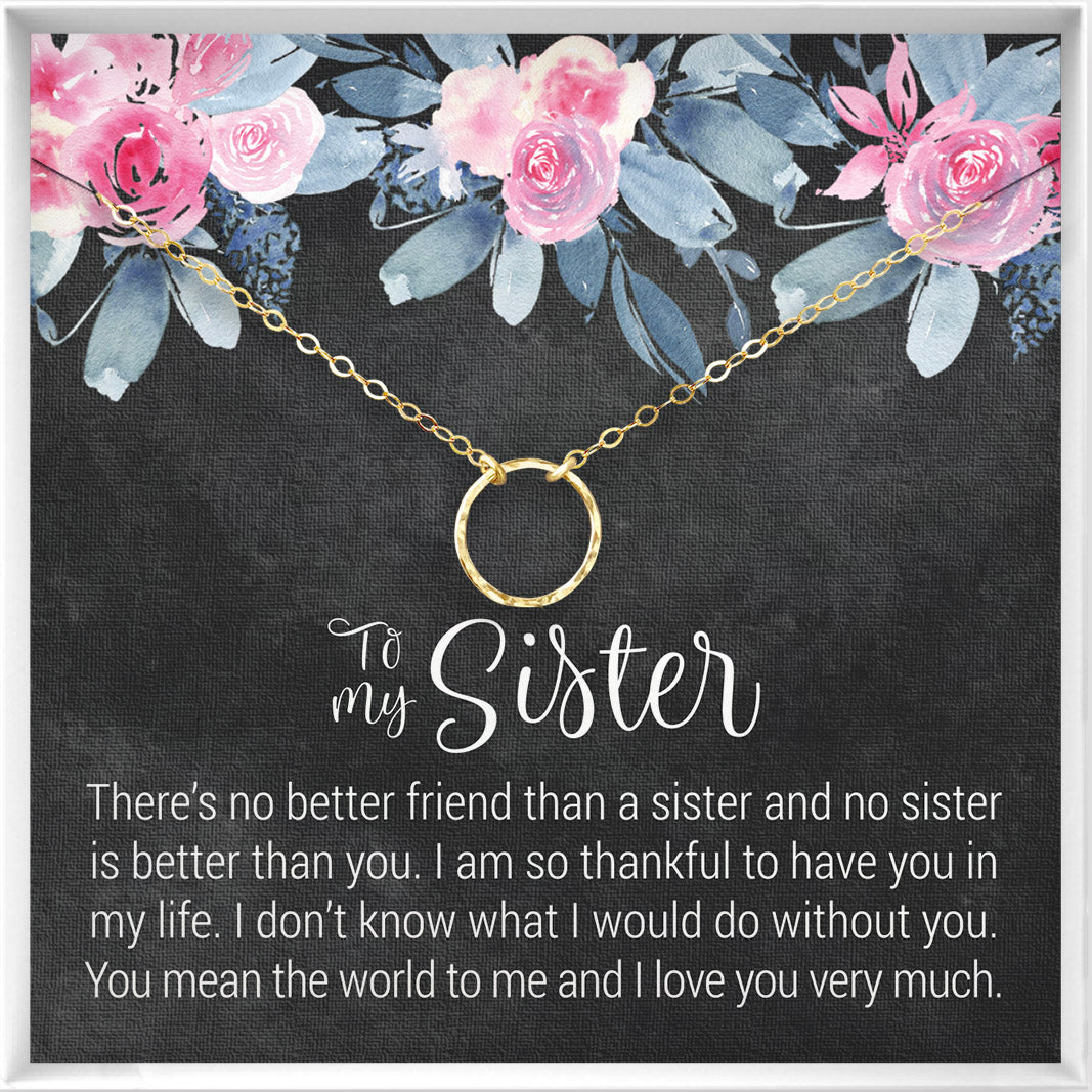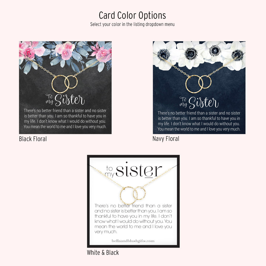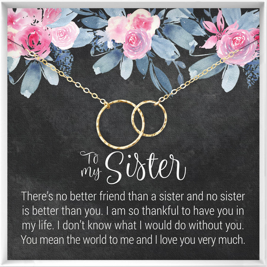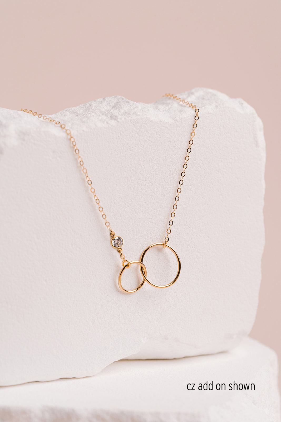 A set of interlocking circles hangs beautifully from our sparkly signature chain.